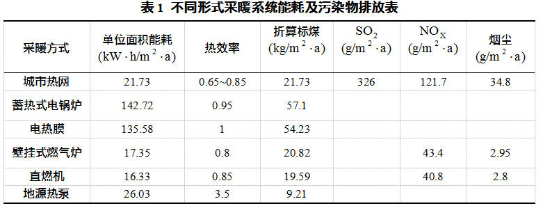 不同形式系統(tǒng)采暖能耗及污染物排放比較如表1所示。